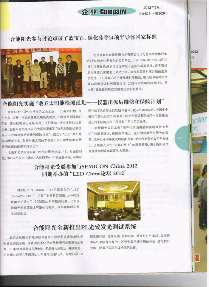 北京合能陽光新能源技術有限公司作為全國半導體設備和材料標準化委員會的委員單位,于2012年3月22日-3月24日在江蘇省徐州參與討論審議了藍寶石單晶晶錠,藍寶石襯底片厚度及厚度變化測試方法,藍寶石單晶襯底片翹曲度測試方法,LED外延芯片用砷化鎵襯底規范,碳化硅單晶拋光片等14項半導體材料國家標準。這些標準的確定將為LED、藍寶石、碳化硅的規范發展奠定堅實的基礎。