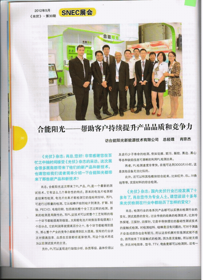 肖總:合能陽(yáng)光這次帶來(lái)了PL產(chǎn)品,PL是一個(gè)最新的測(cè)試技術(shù)。它有這么幾個(gè)革命性的特點(diǎn):原來(lái)的電池片檢測(cè)都是結(jié)果性檢測(cè),電池片出來(lái)才能檢測(cè)它的指標(biāo)和好壞,而PL可進(jìn)行過(guò)程量的檢測(cè),它從硅棒開(kāi)始到硅片到清洗、擴(kuò)散、刻蝕、PECVD、電極印刷、包括燒結(jié)整個(gè)全工藝過(guò)程的檢測(cè)。原來(lái)的檢測(cè)是局限性的,而PL這技術(shù)可以把整個(gè)工藝制程的每一個(gè)環(huán)節(jié)都能提高到極致。太陽(yáng)能電池片轉(zhuǎn)換效率每提高0.1個(gè)百分點(diǎn),它的利潤(rùn)率就提高百分之十,各個(gè)環(huán)節(jié)都能得到提升,那么整個(gè)產(chǎn)業(yè)的競(jìng)爭(zhēng)力都能得到巨大提高?,F(xiàn)有的行業(yè)狀況對(duì)提高效率、品質(zhì)在后面都在逐漸使用,而這個(gè)技術(shù)將成為以后測(cè)試技術(shù)的主流。