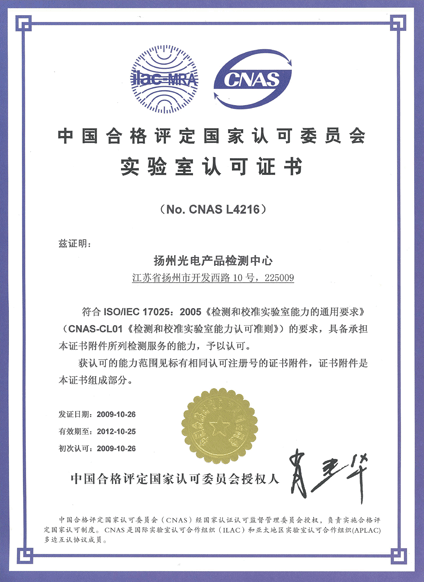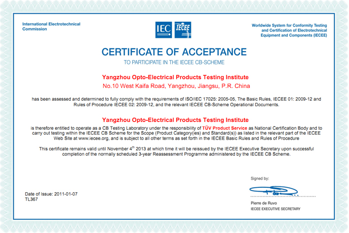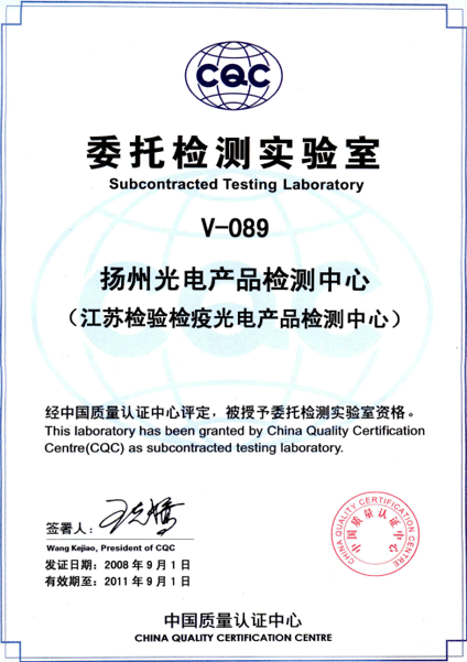 揚(yáng)州光電產(chǎn)品檢測(cè)中心成立于2007年,是專門從事光伏產(chǎn)品檢測(cè)的第三方檢測(cè)機(jī)構(gòu),是國(guó)家質(zhì)量監(jiān)督檢驗(yàn)檢疫總局批準(zhǔn)的全國(guó)唯一從事進(jìn)出口光電產(chǎn)品檢測(cè)的“國(guó)家級(jí)光電產(chǎn)品檢測(cè)重點(diǎn)實(shí)驗(yàn)室”。2011年1月,通過(guò)了IECEE的審核,成為光伏產(chǎn)品檢測(cè)CB實(shí)驗(yàn)室,即CBTL,編號(hào):TL367。